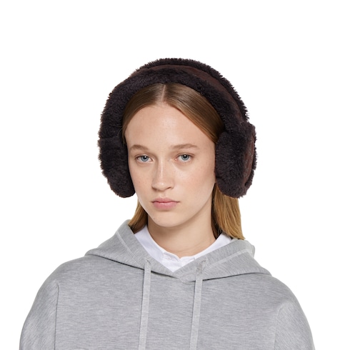 Die Accessoires aus weichen Stoffen und Seide aus der Kollektion hauchen bekannten Codes des Hauses durch raffinierte Besätze, Logo-Patches und dezente Stickereien neues Leben ein. Diese Ohrenschützer aus GG Wildleder und Merinowolle verleihen jedem Look kuschelige Akzente.