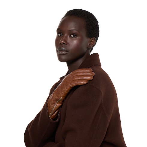Die Accessoires aus weichen Stoffen und Seide aus der Pre-Fall 2025 Kollektion hauchen bekannten Codes des Hauses durch raffinierte Besätze, Logo-Patches und dezente Stickereien neues Leben ein. Diese Handschuhe aus GG Leder zeichnen sich durch einen Reißverschluss mit Doppel G aus.
