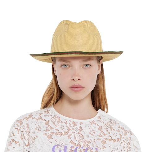 Die textilen Accessoires aus der Pre-Fall 2025 Kollektion hauchen bekannten Codes des Hauses durch raffinierte Besätze, Logo-Patches und dezente Stickereien neues Leben ein. Dieser Hut ist aus naturfarbenem Stroh gefertigt und wird von einem Web-Besatz akzentuiert.