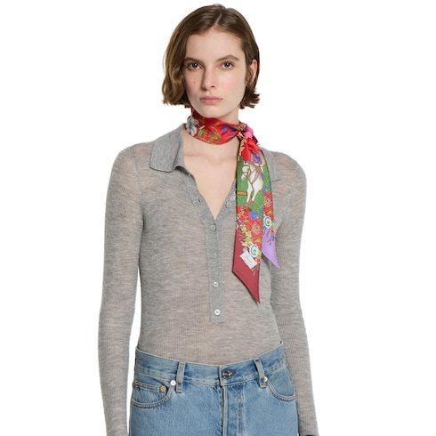Dieses Band aus der Pre-Fall 2025 Kollektion ist aus Seidentwill gefertigt und wird von einem durchgehenden Reitsport- und Blumen-Print geziert.