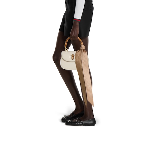 Die Seidenaccessoires aus der Pre-Fall 2025 Kollektion hauchen bekannten Codes des Hauses durch raffinierte Besätze, Logo-Patches und dezente Stickereien neues Leben ein. Dieses Band ist aus GG Jacquard aus Wolle und Seide gefertigt.