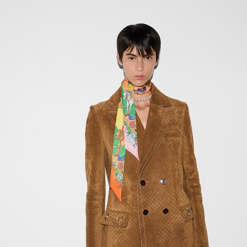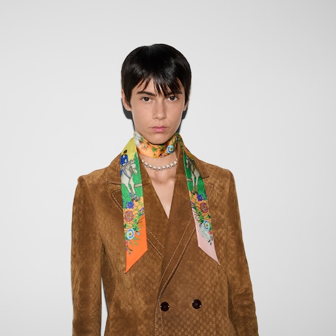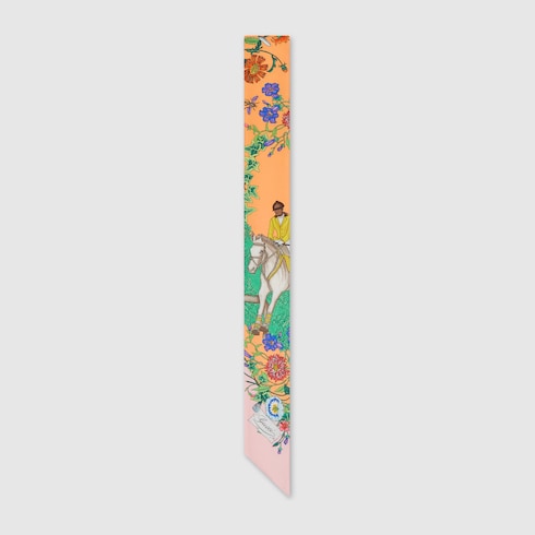 Im Rahmen der Cruise 2025 Kollektion werden charakteristische Symbole und Codes des Hauses auf zeitgemäße Weise interpretiert. Dieses Seidenband steht mit seinem farbenprächtigen floralen Reitsport-Print für Traditionsbewusstsein und zeitgemäßes Flair.