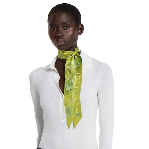 Die Seidenaccessoires aus der Pre-Fall 2025 Kollektion hauchen bekannten Codes des Hauses durch raffinierte Besätze, Logo-Patches und dezente Stickereien neues Leben ein. Dieses vielseitige Band aus Seidentwill erhält durch den durchgehenden Gucci Blumen-Print einen besonderen Akzent.