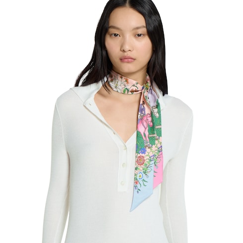 Dieses Band aus der Pre-Fall 2025 Kollektion ist aus Seidentwill gefertigt und wird von einem durchgehenden Reitsport- und Blumen-Print geziert.