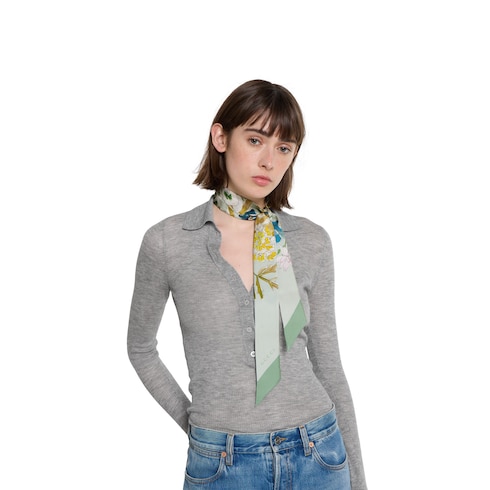 Dieses Band aus der Pre-Fall 2025 Kollektion ist aus Seidentwill gefertigt und wird von einem durchgehenden Blumen-Print geziert. Mit seinen lebendigen Farben, die die Grundtöne der Kollektion aufgreifen, erinnert das Motiv an einen Blumenstrauß im Stil eines Aquarells.