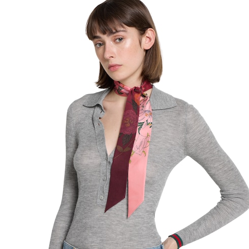 Dieses Band aus der Pre-Fall 2025 Kollektion ist aus Seidentwill gefertigt und präsentiert das historische Flora-Motiv von Gucci in einem neu interpretierten Farbdesign.