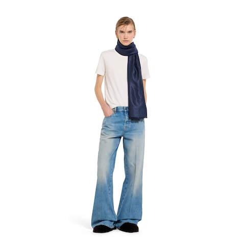 Ob GG, Web, Flora, Bambus, das Horsebit oder andere vom Reitsport inspirierte Details: Die Seidenaccessoires des Hauses setzen auch weiterhin auf symbolträchtige Motive, die durch edle Materialien, aufwendige Handwerkskunst und frische Farben neu interpretiert werden. Dieses Halstuch aus GG Woll- und Seiden-Lamé ist mit einem Fransenabschluss versehen.