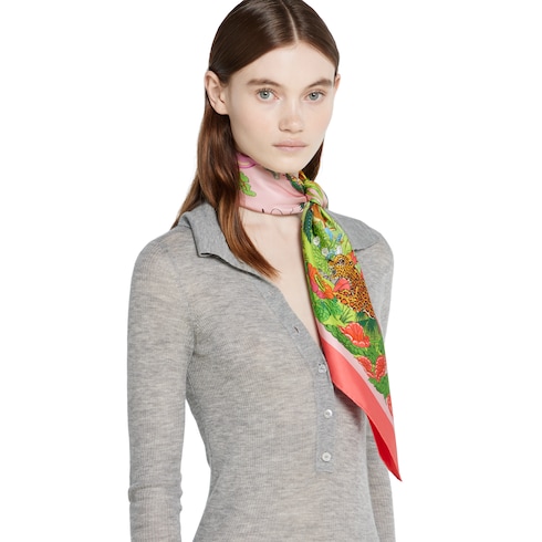 Dieses Vierecktuch ist Teil des 90 x 90 Projekts und präsentiert ein Naturmotiv von Gucci in einem Artwork der Künstlerin Inji Seo, deren Animationen und Illustrationen sich am Schnittpunkt von Popkultur und Kunst bewegen.