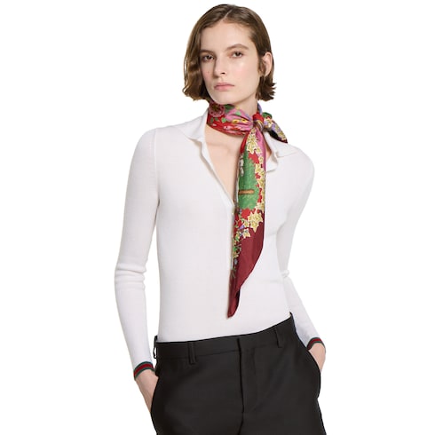 Dieses Vierecktuch aus der Pre-Fall 2025 Kollektion ist aus Seidentwill gefertigt und wird von einem durchgehenden Reitsport- und Blumen-Print geziert.
