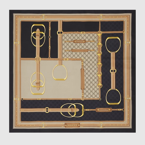 Im Rahmen der Cruise 2025 Kollektion werden charakteristische Symbole und Codes des Hauses auf zeitgemäße Weise interpretiert. Dieses elegante Vierecktuch aus schwarzer Seide wird von einem durchgehenden GG Print mit Gucci Steigbügel und Horsebit vervollständigt.