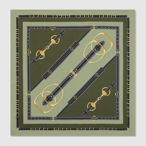 Viele Designs aus der Herbst Winter 2025 Kollektion erinnern an das Erbe des Hauses, so auch dieses Vierecktuch aus Seide mit durchgehendem Gucci Reitsport-Print.