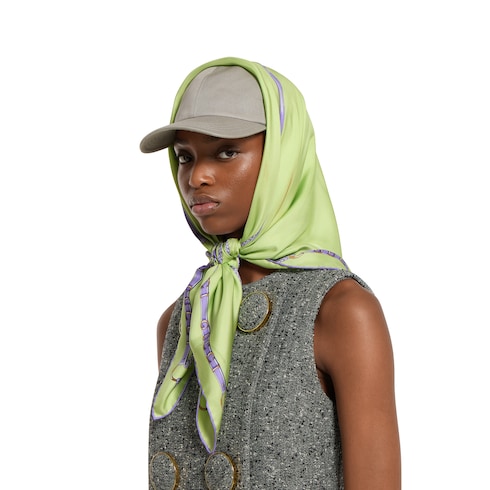 Viele Designs aus der Herbst Winter 2025 Kollektion erinnern an das traditionsreiche Reitsporterbe des Hauses. So auch dieses Vierecktuch aus Seide mit durchgehendem Gucci Gürtel- und Horsebit-Print.