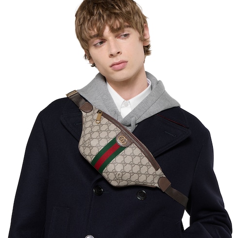 Die Ophidia Linie umfasst charakteristische Accessoires und neue Silhouetten mit weicher Oberfläche in klassischem Beige und Dunkelbraun. Diese Gürteltasche kombiniert ein Design aus beschichtetem GG Monogramm-Stoff mit einem Doppel G und einem Web-Detail.