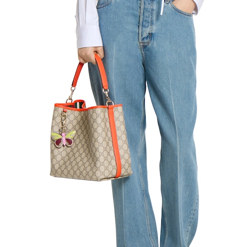Die GG Emblem Kollektion eröffnet einen neuen Blick auf die Geschichte des Hauses, die seit jeher von Eleganz und Handwerkskunst geprägt ist. Die beiden Hauptfächer mit mittigem Reißverschlussfach sowie der Schulterriemen aus Leder, der ein Tragen als Umhängetasche ermöglicht, unterstreichen das funktionale Design dieser Bucket Bag.