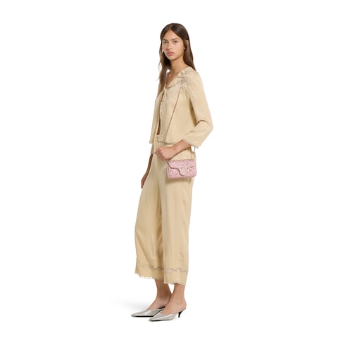 Als eine der Signature-Kollektionen des Hauses vereint die GG Marmont ein weiches Design aus Nubukleder mit einem vielseitigen Kettenriemen und dem Doppel G Schmuckteil. Ergänzt wird diese Schultertasche durch einen eleganten Kristallbesatz.