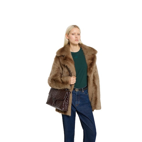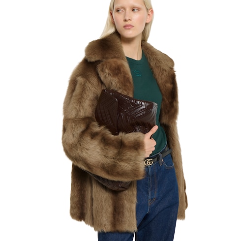 In der Herbst Winter 2025 Kollektion, als eine der Signature-Kollektionen des Hauses vereint die GG Marmont ein weiches, strukturiertes Design mit einem vielseitigen Kettenriemen und dem symbolträchtigen Doppel G. Dieses Modell aus weichem, leichtem Matelassé-Leder mit Chevron-Muster inszeniert das Schmuckteil und den Kettenriemen in einem farblich abgestimmten Look aus Emaille.