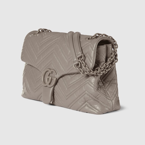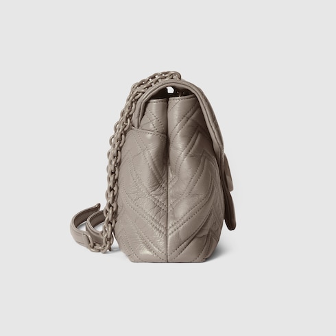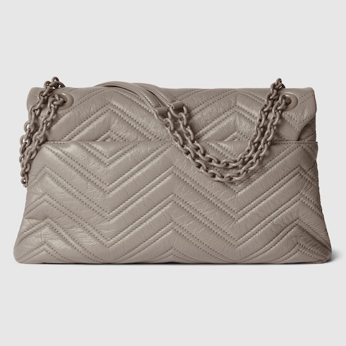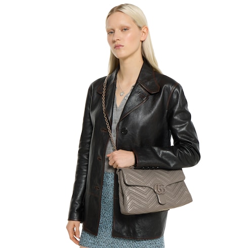 In der Herbst Winter 2025 Kollektion, als eine der Signature-Kollektionen des Hauses vereint die GG Marmont ein weiches, strukturiertes Design mit einem vielseitigen Kettenriemen und dem symbolträchtigen Doppel G. Dieses Modell aus weichem, leichtem Matelassé-Leder mit Chevron-Muster inszeniert das Schmuckteil und den Kettenriemen in einem farblich abgestimmten Look aus Emaille.