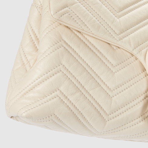 In der Herbst Winter 2025 Kollektion, als eine der Signature-Kollektionen des Hauses vereint die GG Marmont ein weiches, strukturiertes Design mit einem vielseitigen Kettenriemen und dem symbolträchtigen Doppel G. Dieses Modell aus weichem, leichtem Matelassé-Leder mit Chevron-Muster inszeniert das Schmuckteil und den Kettenriemen in einem farblich abgestimmten Look aus Emaille.