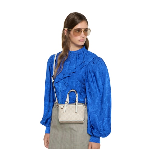 Die GG Emblem Kollektion präsentiert zeitgemäß inszenierte Kleinlederwaren für Damen, in denen sich Essentials für den Alltag ideal aufbewahren lassen. Diese Mini-Tasche ist aus beschichtetem GG Monogramm-Stoff in Beige und Weiß gefertigt. Komplettiert wird das Modell von einem weißen Lederbesatz sowie einem verstell- und abnehmbaren Schulterriemen aus Leder.