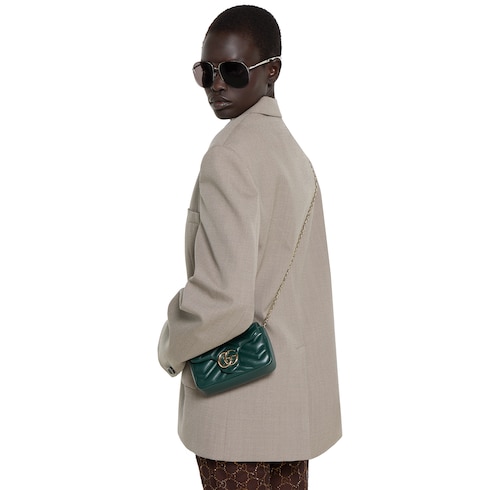 Im Rahmen der GG Marmont Kollektion erscheinen neue Mini-Silhouetten in frischen Farben wie diese Mini-Schultertasche aus grünem Matelassé-Leder mit Chevron-Muster. Komplettiert werden die Designs vom unverkennbaren Doppel G Schmuckteil mit hellgoldfarbenem Finish.