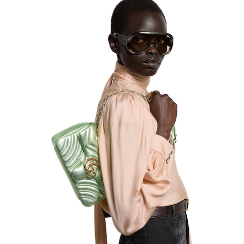 Als eine der Signature-Kollektionen des Hauses vereint die GG Marmont ein weiches, strukturiertes Design mit einem vielseitigen, hellgoldfarbenen Kettenriemen. Diese Schultertasche aus Lamé-Leder zieht darüber hinaus mit ihrer stilvollen hellgrünen Farbe die Blicke auf sich.