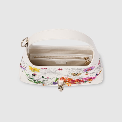 Diese Gucci Jackie 1961 Schultertasche aus der Pre-Fall 2025 Kollektion kombiniert ein Design aus weißer Seide mit dem Flora-Print, einem Motiv aus den Archiven, das durch gestickte Details auf filigrane Weise neu interpretiert wird. Ein weißer Lederbesatz, ein hellgoldfarbener Kolbenverschluss und ein zusätzlicher Schulterriemen komplettieren das Modell.