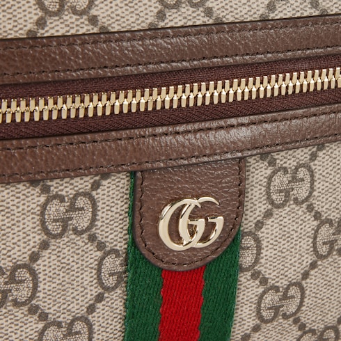 Mit dem charakteristischen Web und dem hellgoldfarbenen Doppel G Symbol rückt die Ophidia Kollektion traditionsreiche Details des Hauses in den Fokus. Die Modelle sind aus weichem, beschichtetem GG Monogramm-Stoff mit einem Futter aus grüner Baumwolle gefertigt. Diese Kosmetiktasche ist mit einem Henkel und einem Schulterriemen ausgestattet.