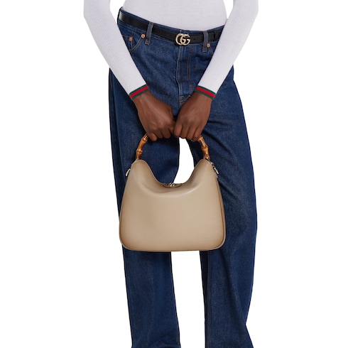 Die Gucci Diana, eine der Signature-Linien des Hauses und bekannt für ihren unverkennbaren Bambusgriff, wird für Pre-Fall 2025 in einem Design aus genarbtem Leder mit Farbverlauf präsentiert. Dieses Modell kann sowohl als Schulter- als auch als Umhängetasche getragen werden.