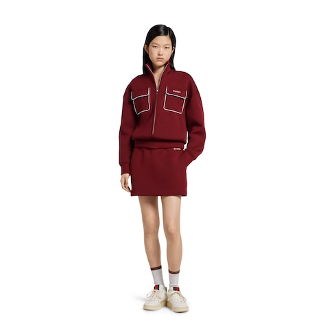 Im Rahmen der Pre-Fall 2025 Kollektion setzen Röcke und Kleider in lebendigen Farben einen besonderen Akzent in der Ready-To-Wear-Auswahl für die Übergangszeit. Dieser Minirock aus Viskosejersey ist im charakteristischen Gucci Rosso Ancora Rot gehalten und mit einem Gucci Logo-Detail versehen.