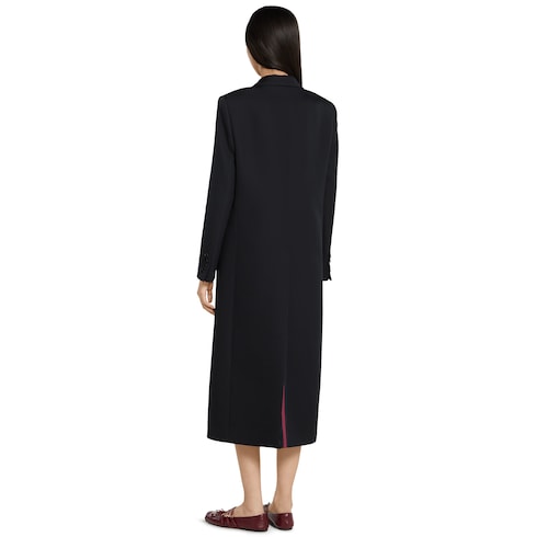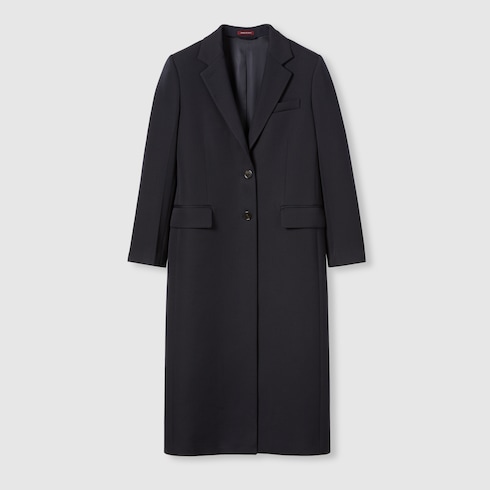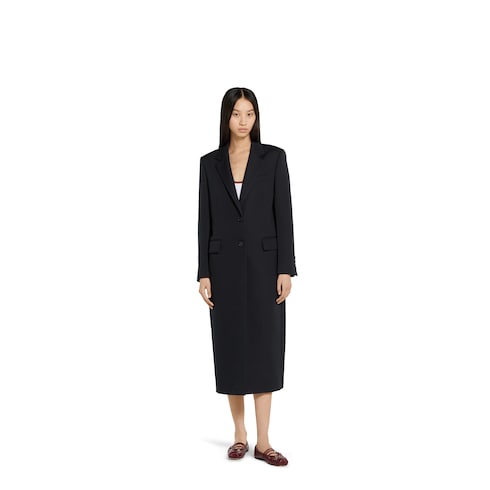 Elegante Outerwear-Looks aus wärmenden Materialien werden für die Pre-Fall 2025 Kollektion neu gedacht und erscheinen sowohl in traditionellen als auch zeitgemäßen Silhouetten. Dieser einreihige Mantel aus Woll-Doppelgewebe zeigt sich mit einer figurbetonten Taillenpartie, die das Design elegant in Szene setzt.
