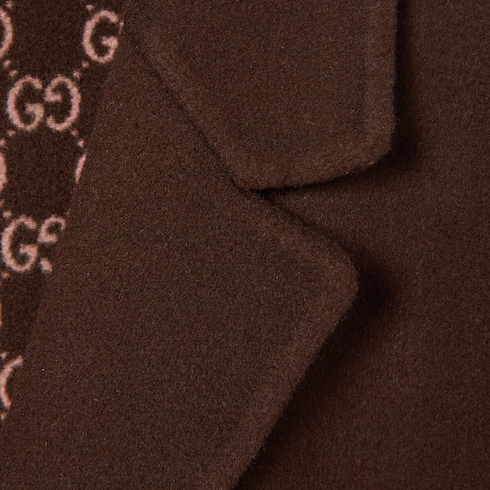 Elegante Outerwear-Looks aus wärmenden Materialien werden für die Pre-Fall 2025 Kollektion neu gedacht und erscheinen sowohl in traditionellen als auch zeitgemäßen Silhouetten. Dieser klassische Mantel besticht durch ein wendbares Design mit einfarbiger Wolle auf einer Seite und dem GG Motiv in Braun und Hellrosa auf der anderen Seite.