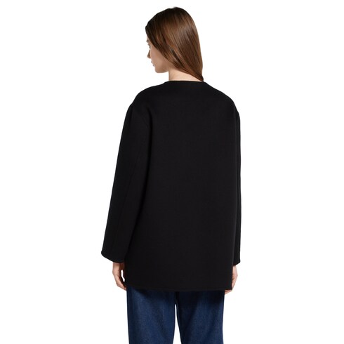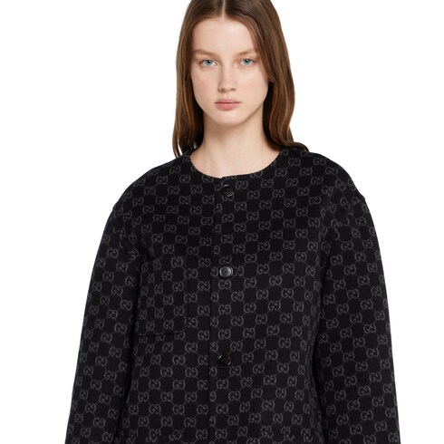 Elegante Outerwear-Looks aus wärmenden Materialien werden für die Pre-Fall 2025 Kollektion neu gedacht und erscheinen sowohl in traditionellen als auch zeitgemäßen Silhouetten. Diese Jacke besticht durch ein wendbares Design mit einfarbiger Wolle und Seide auf einer Seite und einem grauen GG Motiv auf der anderen Seite.