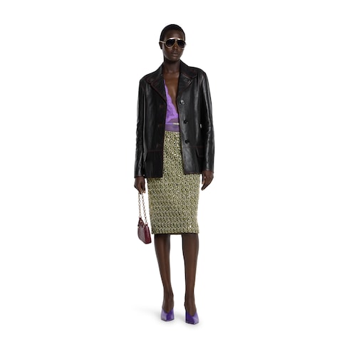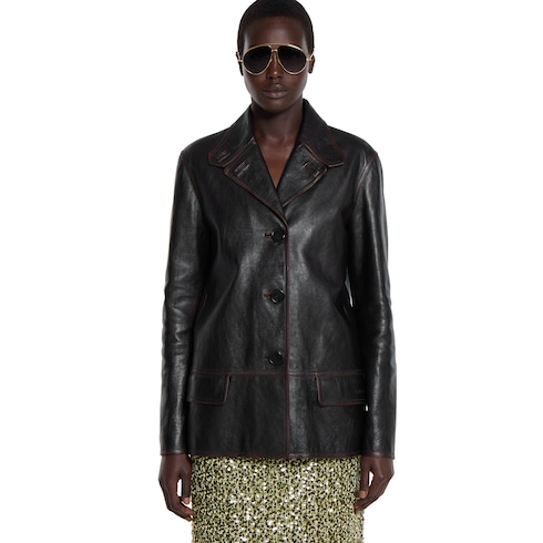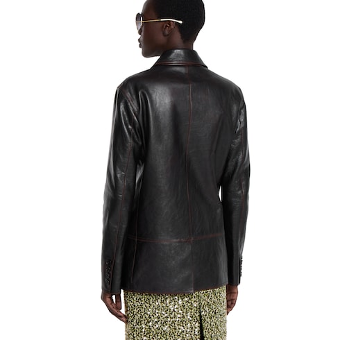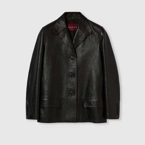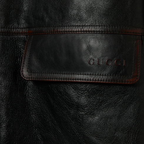 Ein von Vintage-Mode inspirierter Designansatz prägt die Outerwear-Silhouetten aus der Herbst Winter 2025 Kollektion. Diese Lederjacke in Used-Optik ist mit einem breiten Revers und Pattentaschen versehen. Abgerundet wird das Modell von einem farblich abgestimmten Futter aus GG Jacquard und Hornknöpfen.