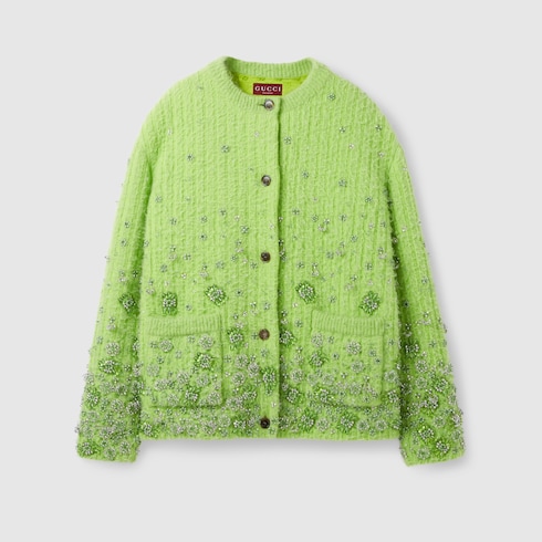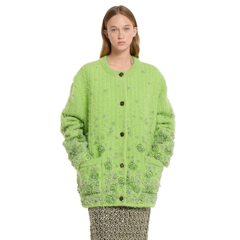 Im Rahmen der Herbst Winter 2025 Kollektion wird eine klassische Outerwear-Silhouette durch sanfte Strukturen und raffinierte Details neu in Szene gesetzt. Diese Wolljacke mit Rundhalsausschnitt und Knopfverschluss auf der Vorderseite ziert eine Perlen-Stickerei mit Blumen-Motiv, die sich am Saum und an den Ärmeln verdichtet. Aufgesetzte Taschen runden das Design ab.