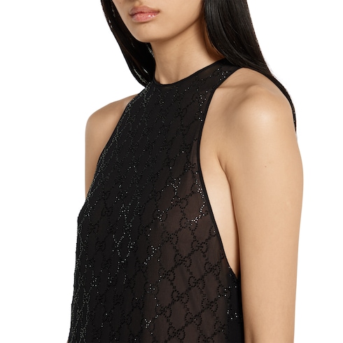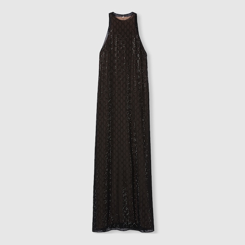 Elegante Materialien in hellen und dunklen Tönen verleihen raffinierten Silhouetten aus der Pre-Fall 2025 Kollektion eine besondere Sinnlichkeit. Dieses lange Kleid aus leichtem Seidengeorgette wird mit der GG Kristall-Stickerei zum Blickfang.
