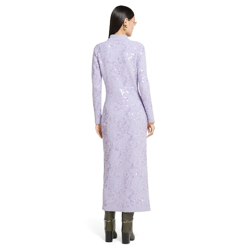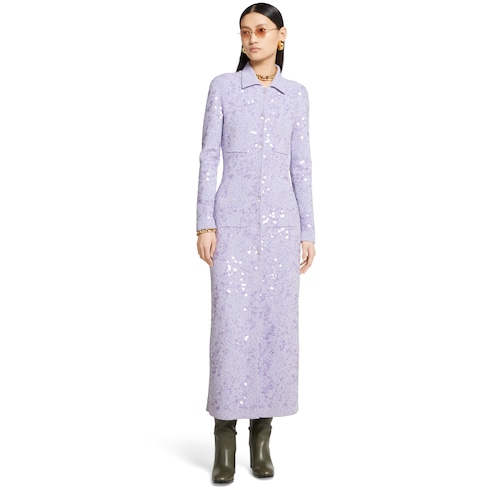 Im Rahmen der Pre-Fall 2025 Kollektion setzen Röcke und Kleider in lebendigen Farben einen besonderen Akzent in der Ready-To-Wear-Auswahl für die Übergangszeit. Bei diesem Kleid aus feiner Viskose wird ein zarter Farbton mit einer durchgehenden Pailletten-Stickerei kombiniert.