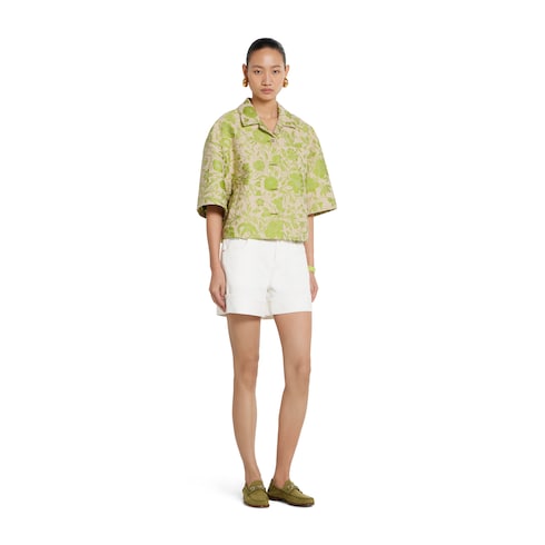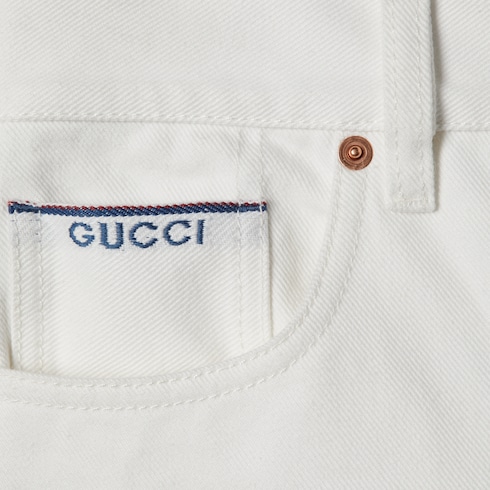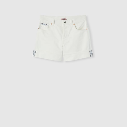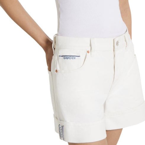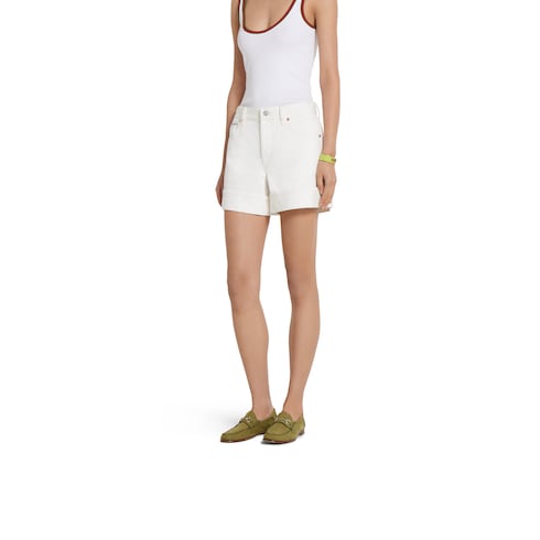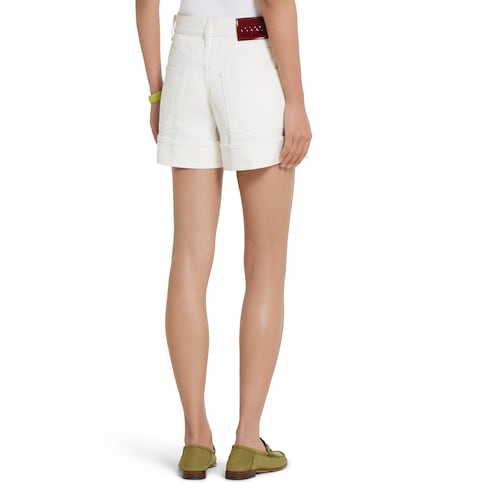 In der Pre-Fall 2025 Kollektion treffen vielfältige Strukturen auf raffinierte Details. Klassische Denim-Designs werden passend zum Wechsel der Jahreszeiten mit unverkennbaren Etiketten oder Stickereien kontinuierlich weiterentwickelt. Diese Shorts aus Denim kombinieren ein Etikett aus Naplakleder in Gucci Rosso Ancora auf der Rückseite mit Gucci Webkanten-Details auf der Vorderseite.
