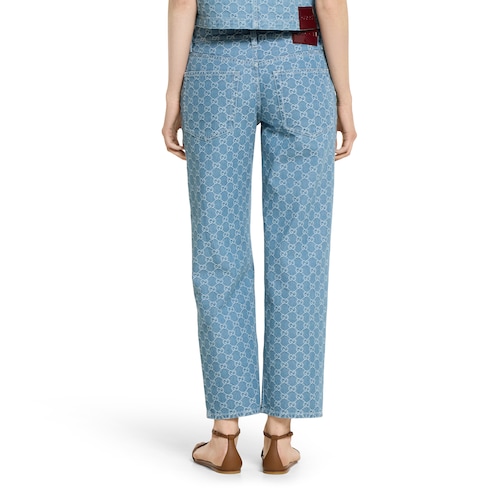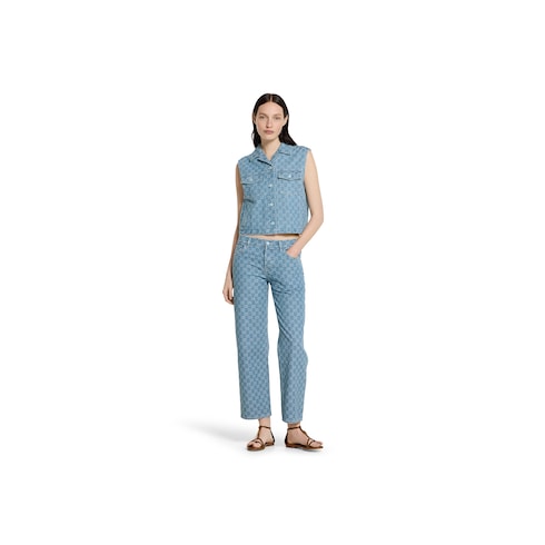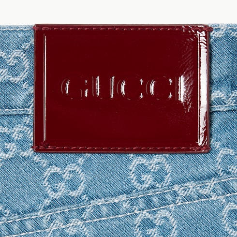 Die klassischen Motive des Hauses werden in der Pre-Fall 2025 Kollektion auf raffinierten Materialien wie legerem Denim, leichtem Canvas und hochwertigem Wildleder präsentiert. Bei dieser Hose trifft eine zeitgemäße Silhouette aus GG Denim-Jacquard auf einen farblich abgestimmten Gucci Knopf aus Emaille sowie ein Etikett aus Naplakleder.