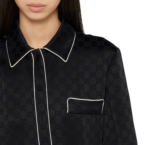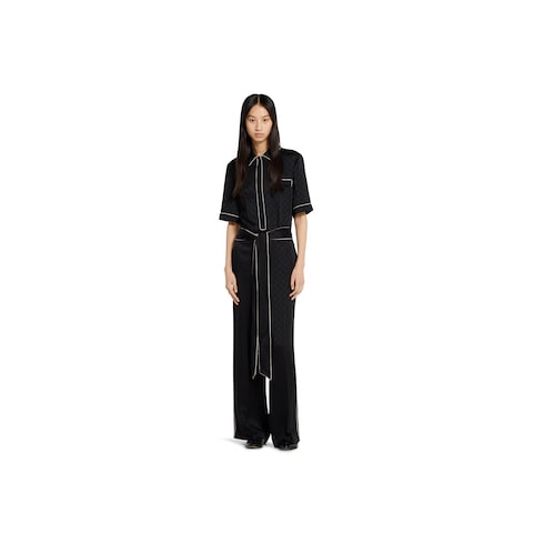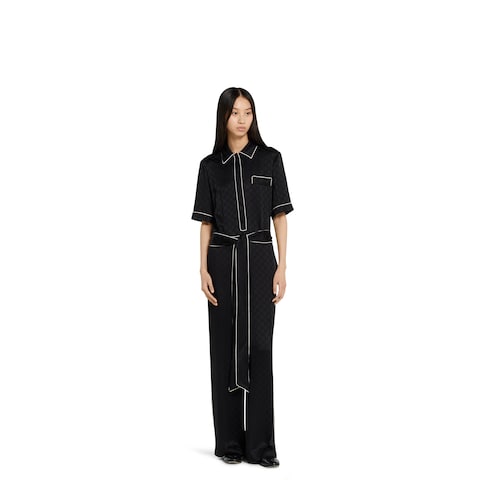 Mit einer monochromen Farbpalette und zarten Akzenten wie Stickereien oder Logo-Details schafft die Pre-Fall 2025 Kollektion eine Garderobe, die sich perfekt tagsüber wie auch abends tragen lässt. In einem Spiel mit Kontrasten ist dieser kurzärmlige Jumpsuit aus schwarzem GG Satin mit einer weißen Paspelierung versehen.