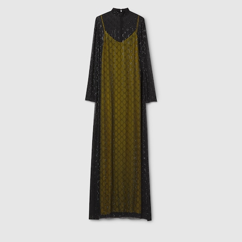 Kristalldetails veredeln eine Reihe besonderer Looks, die einen mühelosen Übergang vom Tag zum Abend schaffen. Charakteristische Motive wie das GG und das Horsebit bilden dabei die Grundlage für faszinierende Neuinterpretationen. Dieses lange Kleid aus leichtem, schwarzem Seidengeorgette wird von einer durchgehenden GG Kristall-Stickerei geziert.