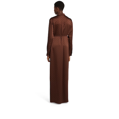 Elegante Materialien in hellen und dunklen Tönen verleihen raffinierten Silhouetten aus der Pre-Fall 2025 Kollektion eine besondere Sinnlichkeit. Dieses Kleid aus GG Satin verfügt über eine einfache Knopfleiste auf der Vorderseite und wird von einem abnehmbaren Gürtel mit Doppel G Schnalle komplettiert.