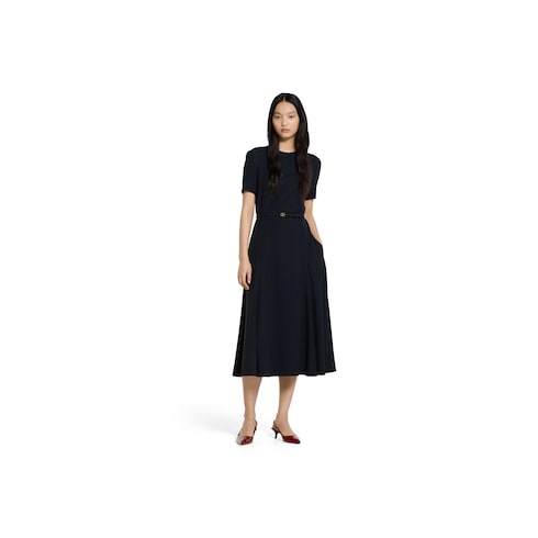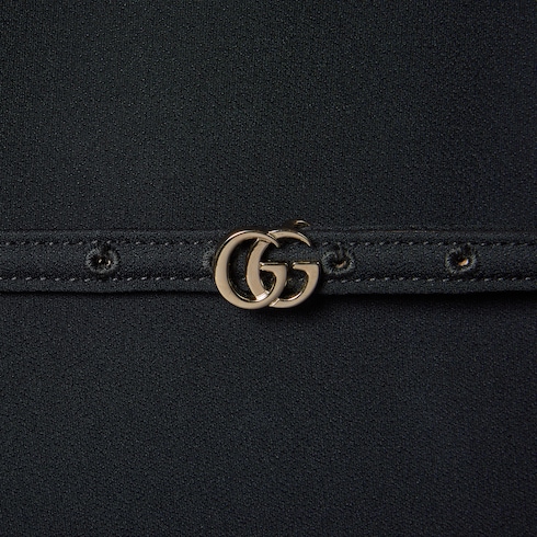 Elegante Materialien in hellen und dunklen Tönen verleihen raffinierten Silhouetten aus der Pre-Fall 2025 Kollektion eine besondere Sinnlichkeit. Dieses Kleid aus Viskose-Satin wird von einem abnehmbaren Ledergürtel mit Doppel G Schnalle komplettiert. Kurze Ärmel und ein Tellerrock runden das Modell ab.