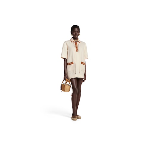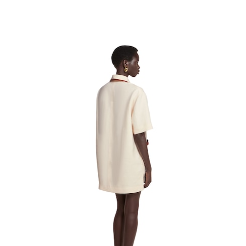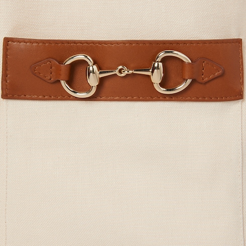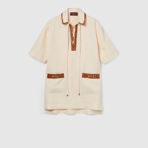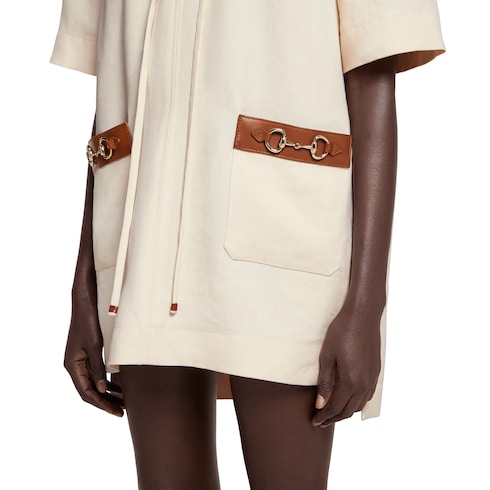 Die klassischen Motive des Hauses werden in der Pre-Fall 2025 Kollektion auf raffinierten Materialien wie legerem Denim, leichtem Canvas und hochwertigem Wildleder präsentiert. Dieses Kleid aus Leinencanvas zeichnet sich durch ein einzigartiges Schnürdetail am Ausschnitt aus. Ein Horsebit-Schmuckteil ziert die beiden Taschen auf der Vorderseite.