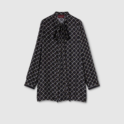 Die Ready-To-Wear-Designs aus der Cruise 2026 Damenkollektion setzen traditionsreiche Motive durch innovative Prints in lebendigen Farben neu in Szene. Dieses Kleid aus schwarzem Seidentwill wird von einem durchgehenden Gucci Horsebit-Print geziert.