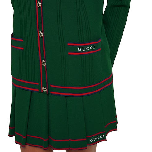 Das Haus setzt seine Reise in die Tenniswelt fort, die in den 1970ern ihren Anfang nahm. Präsentiert werden dabei unverwechselbare Designs aus innovativen Materialien mit dem Gucci Web und anderen klassischen Details. Dieser Cardigan aus feiner Viskose ist mit einem kontrastierenden Streifen-Besatz in Rot sowie einer Gucci Stickerei versehen.