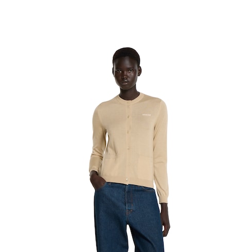 Im Stil der legeren Grandezza, für die das Haus bekannt ist, präsentiert die Pre-Fall 2025 Kollektion elegante Strickmode wie diesen Cardigan aus feiner Kaschmir-Seiden-Mischung mit Rundhalsausschnitt.