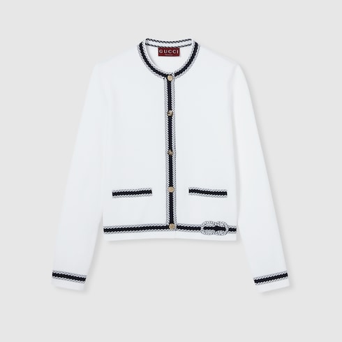 Maritime Designs, inspiriert vom Meer, verleihen der Pre-Fall 2025 Kollektion mit Streifen, unverwechselbaren Motiven und kontrastierenden Besätzen eine frische Note. Dieser Cardigan aus Baumwolle mit Nadelstich wird von einem aufwendig gearbeiteten, geknüpften Intarsien-Besatz in Blau geziert.