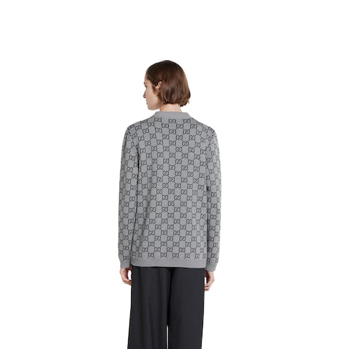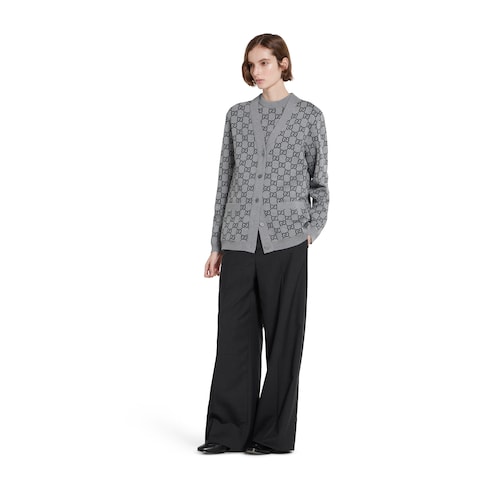 Das GG Motiv wird in unerwarteten Farben und Stoffkombinationen präsentiert, die von Leinenmischung bis zu Nylon reichen. Dieser wendbare Cardigan mit V-Ausschnitt besticht durch ein Design aus feinem GG Wolljacquard mit umgekehrter Farbkombination auf der anderen Seite.