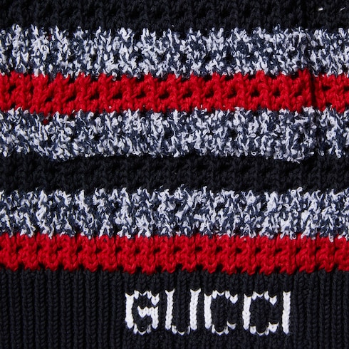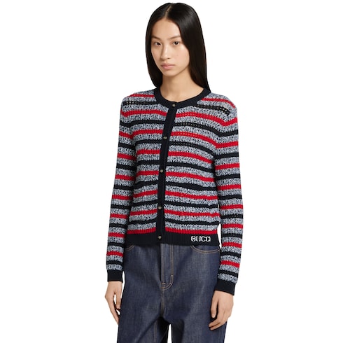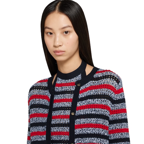 Maritime Designs, inspiriert vom Meer, verleihen der Pre-Fall 2025 Kollektion mit Streifen, unverwechselbaren Motiven und kontrastierenden Besätzen eine frische Note. Dieser Cardigan aus feinem, gestreiftem Baumwollstrick ist mit einer dezenten Gucci Intarsie versehen.