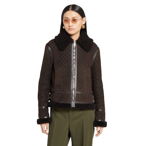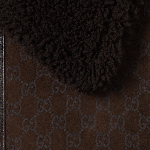 Elegante Outerwear-Looks aus wärmenden Materialien werden für die Pre-Fall 2025 Kollektion neu gedacht und erscheinen sowohl in traditionellen als auch zeitgemäßen Silhouetten. Diese Jacke aus Wildleder und Shearling wird mit einem durchgehenden GG Print präsentiert. Ein Lederbesatz verleiht dem funktionalen, stilvollen Design farblich abgestimmte Akzente.